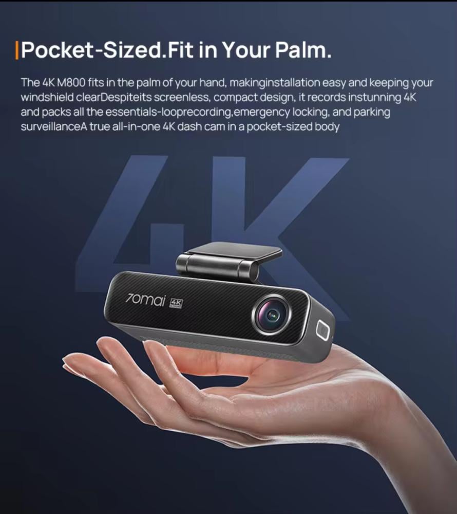 كاميرا 70mai M800 4K هي كاميرا سيارة متقدمة تُستخدم لتسجيل الطريق بدقة عالية تُعادل Ultra HD 4K. تتميَّز هذه الكاميرا بتقنية تصوير أمامية عالية الجودة وخلفية، مع ميزات مثل HDR لرؤية ليلية محسَّنة، ووسائل حماية الفيديو والأدلة الملتقطة في حالات الحوادث. الكاميرا تُعد خيارًا ممتازًا لمن يهتم بالأمان المروري والتوثيق الكامل.